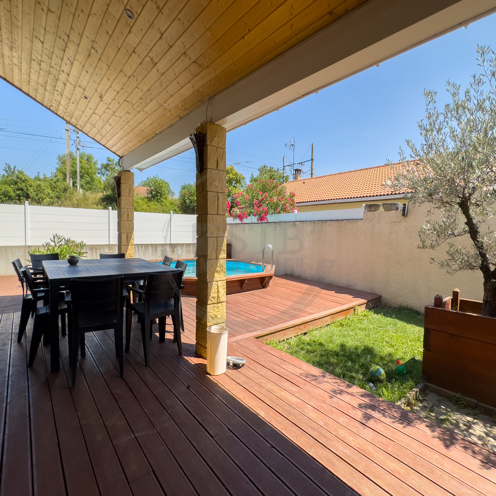 Nous proposons cette maison de 75m2 habitables environ sur 235m2 de terrain avec terrasse couverte, piscine enterrée et garage.